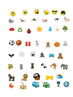 - The program has "stamps". There are tons of little pictures that your child can transfer to the screen just by choosing the one they want and then tapping as many times as they like. Even better, each stamp has a sound effect. So the frog croaks, the crying face cries, the dog barks, and so on. Your child can label the stamp or imitate the sound effect. Even if they are non-verbal and using signs, you can wait until they make the sign for "more" before you let them put more stamps on the page. Here is a sampling of the stamps available. There are many more than would fit on one page.