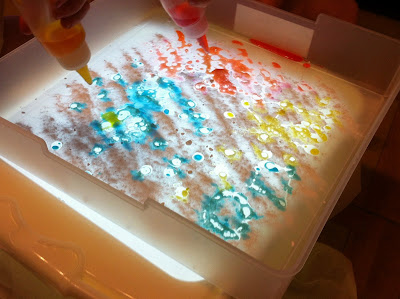 I grabbed one light box and the translucent tray to go on top. I also got out some baking soda, food coloring, and four 2 oz squeeze bottles filled about halfway with vinegar and gathered the children around the light box on the kitchen floor.