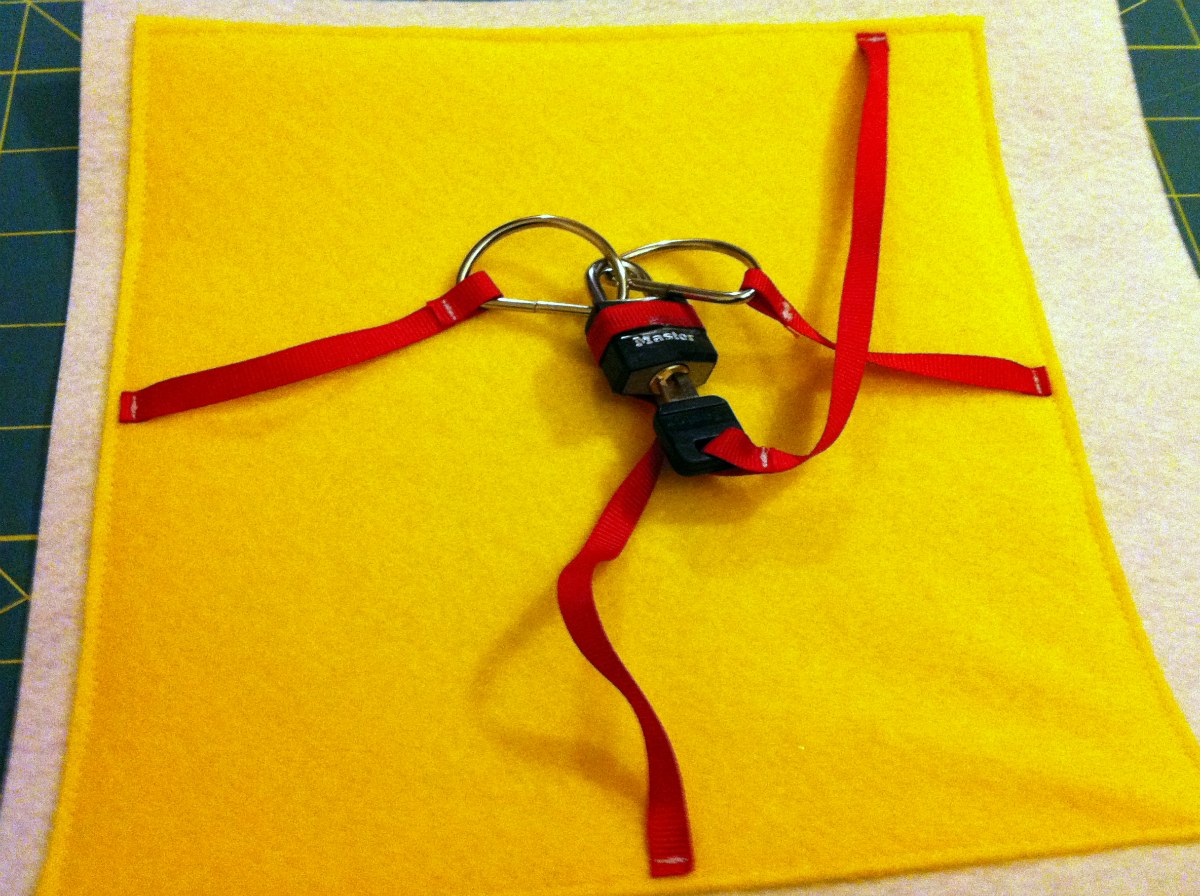 I cut out all the pieces and attached the sun, flower stems, and petals first. Then I sewed on the buttons. The flowers are simple two layer circles. I taught myself how to use the buttonhole feature on my sewing machine (much easier than I expected) and put button holes in the two-layer felt circles. Then I used my pinking shears to jazz up the edges of two of the flowers and finally sewed the edges together with a simple circle.