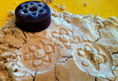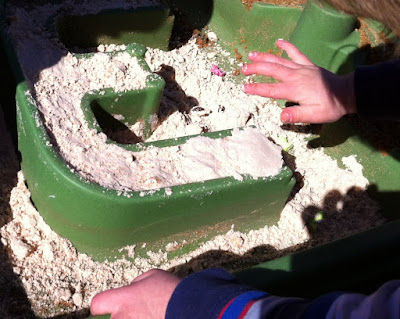 We made some cloud dough the next day from flour and baby oil and the kids used the stamps. They really enjoyed using the stamps and they worked fairly well. (Cloud dough takes 5 minutes to make and is wonderful to play with. If you haven't tried it you definitely should.)