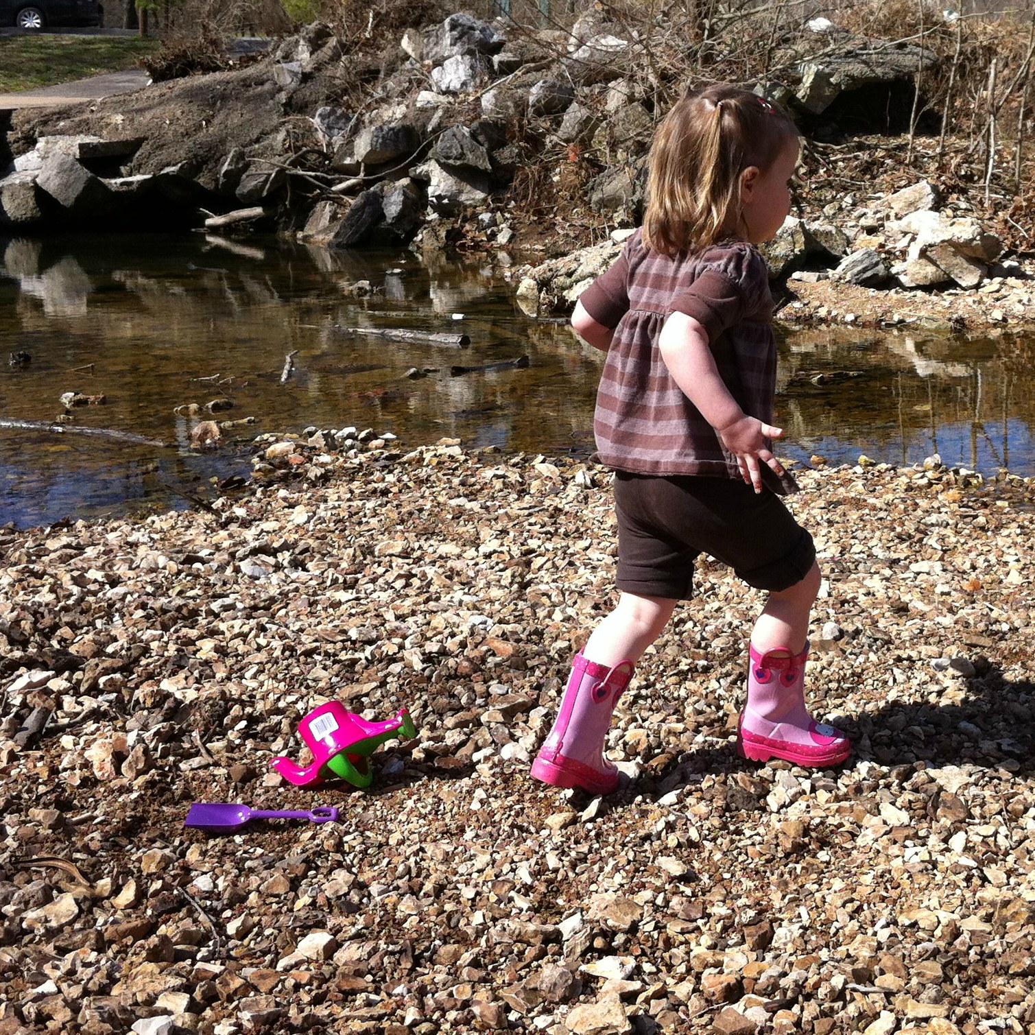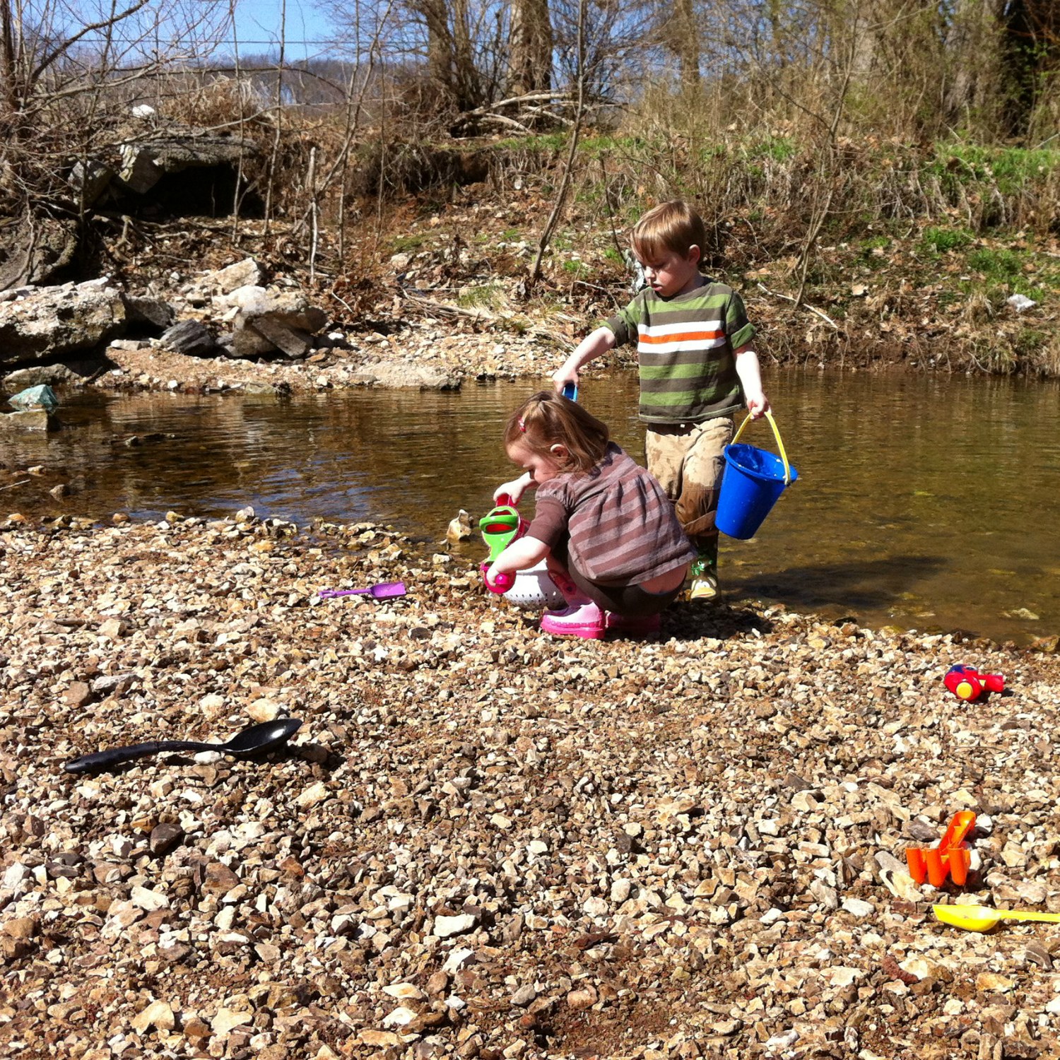 We went to the store and bought a wide variety of inexpensive toys that would make for fun play in a creek. Off the top of my head that meant buckets, watering cans, small shovels and rakes, colanders, turkey basters, big kitchen stirring spoons, a small plastic dump truck, etc. I also picked up a small laundry basket to dump all the wet toys into at the end of play to stick in the back of the minivan. And of course, there was the first pair of rain boots/wading boots my children have owned. Boy were they excited about the boots.