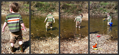 Ava was tentative. After briefly testing the water at a depth of about one inch she decided to stick to the shore. Before letting Michael go, I explained that he should only go in until the water reached to about two inches below the top of his boots. I got his attention. I looked him in the eye. I pointed to the two inch from the top spot on his boots. Then I set him free. He loved it. He went further and further in. I just let him. When he had reached the point at which I could see the water pouring into the tops of his boots I inquired, from my sunny spot on the bank of the creek, "Sweetheart, do you notice anything about your boots?" He looked towards me is puzzlement and replied, "Huh?" So I told him, "Nevermind," and just let him go.