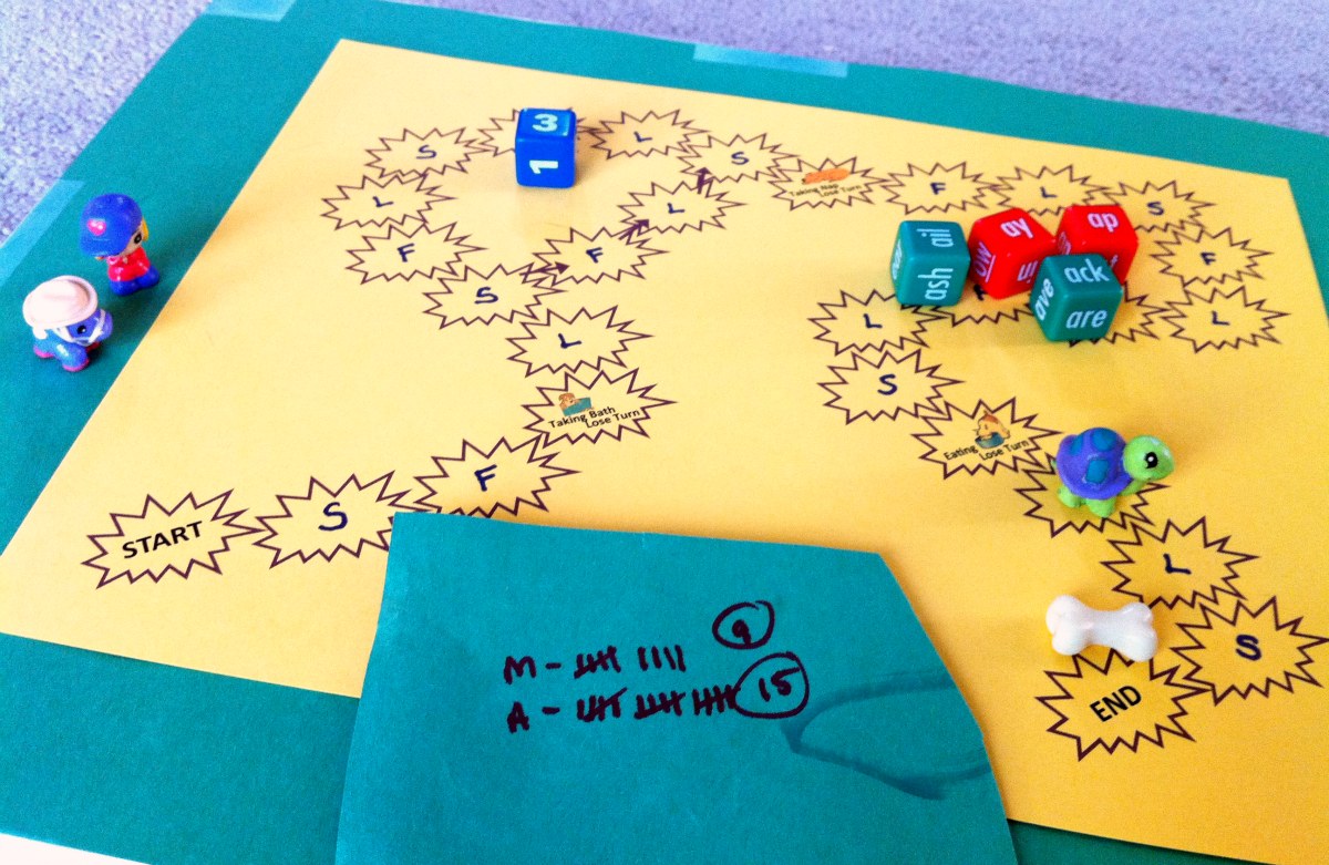 - Students take turns rolling the number die and moving that many spaces on the game board. This selects their initial consonant.
