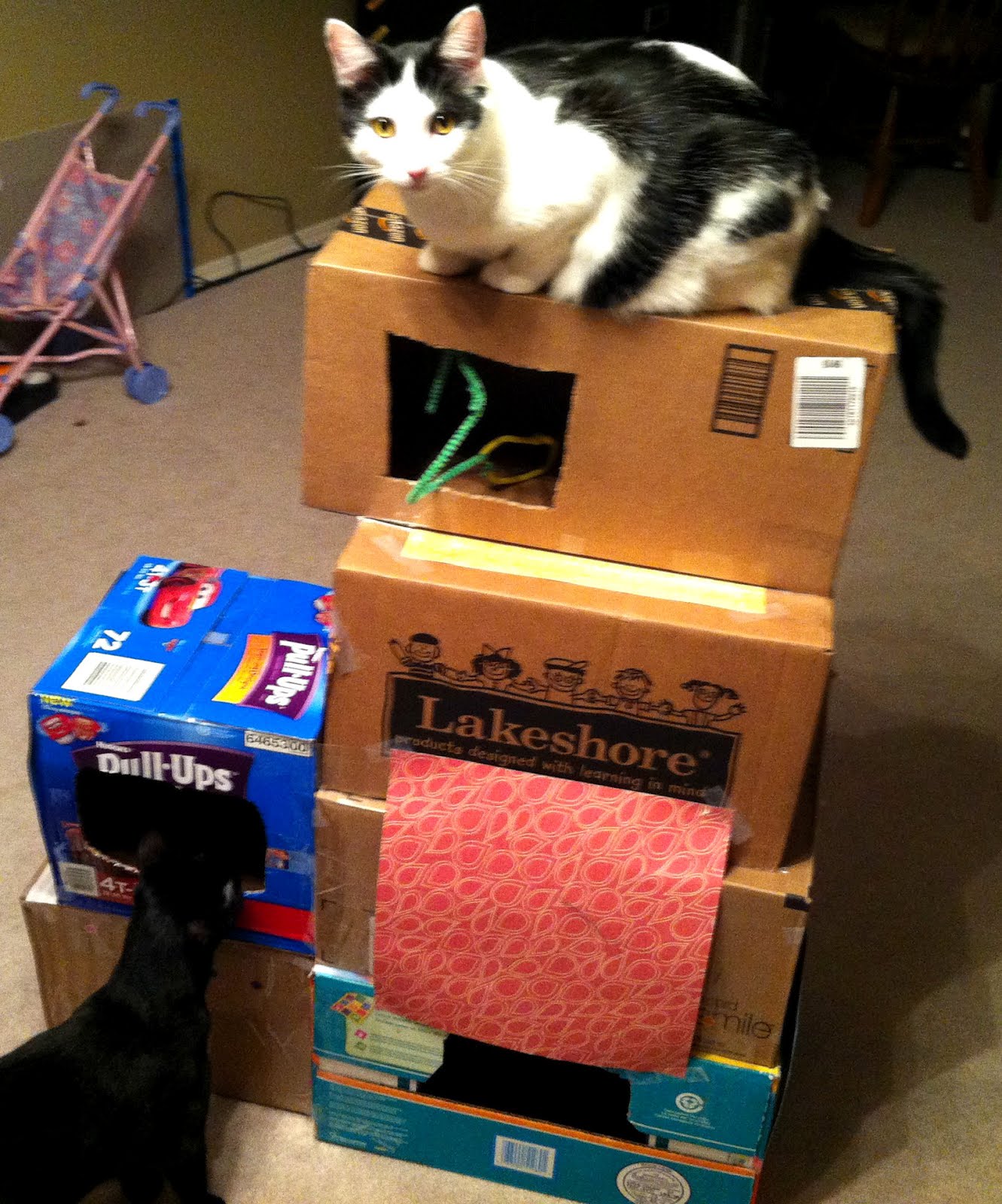 I decided to redirect Michael to a project that might actually be useful. We collected sturdy, decently sized boxes and built a four story, six room, double-wide kitty condo. The boxes are held together with packing tape. Scissors cut openings in the boxes and we used pipe cleaners as toys to tempt the kitties in. I did most of the work while Michael "helped" by enthusiastically bounding around, decorating the condo by taping on scrapbook paper (often covering entrances), and twisting up pipe cleaners into interesting shapes and calling them kitty toys.