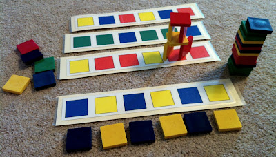 I found adhesive backed magnetic strips at our local big box store for less than a dollar. I stuck one strip to each of four jumbo sized popsicle sticks and then colored around the magnet strips with sharpies to match the four colors of paper clips I happened to have. Done. The children will sort the paper clips by color and attach them to the color coordinated stick via the magnetic strip. Insipiration here. For a slightly different version without magnets here.