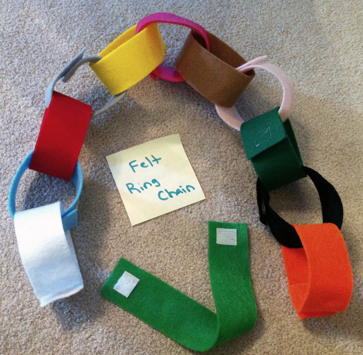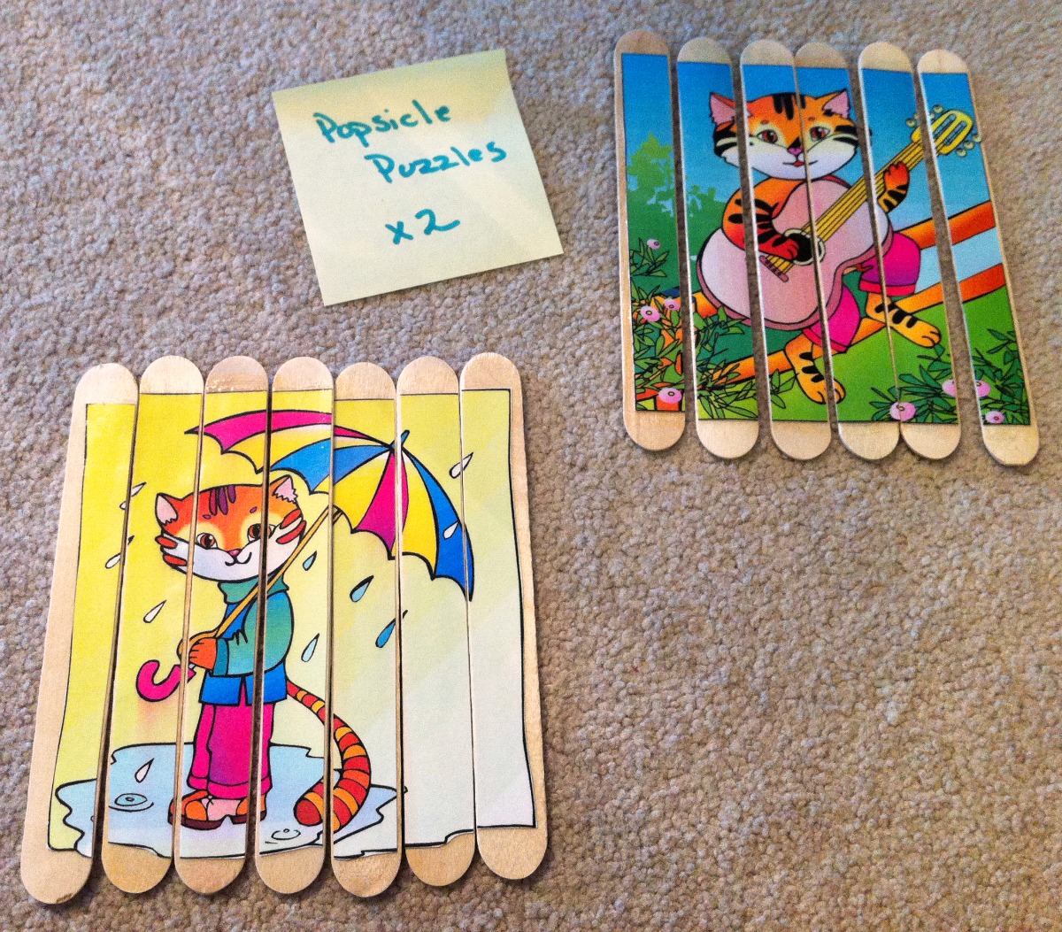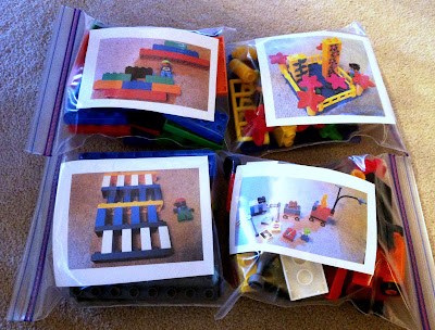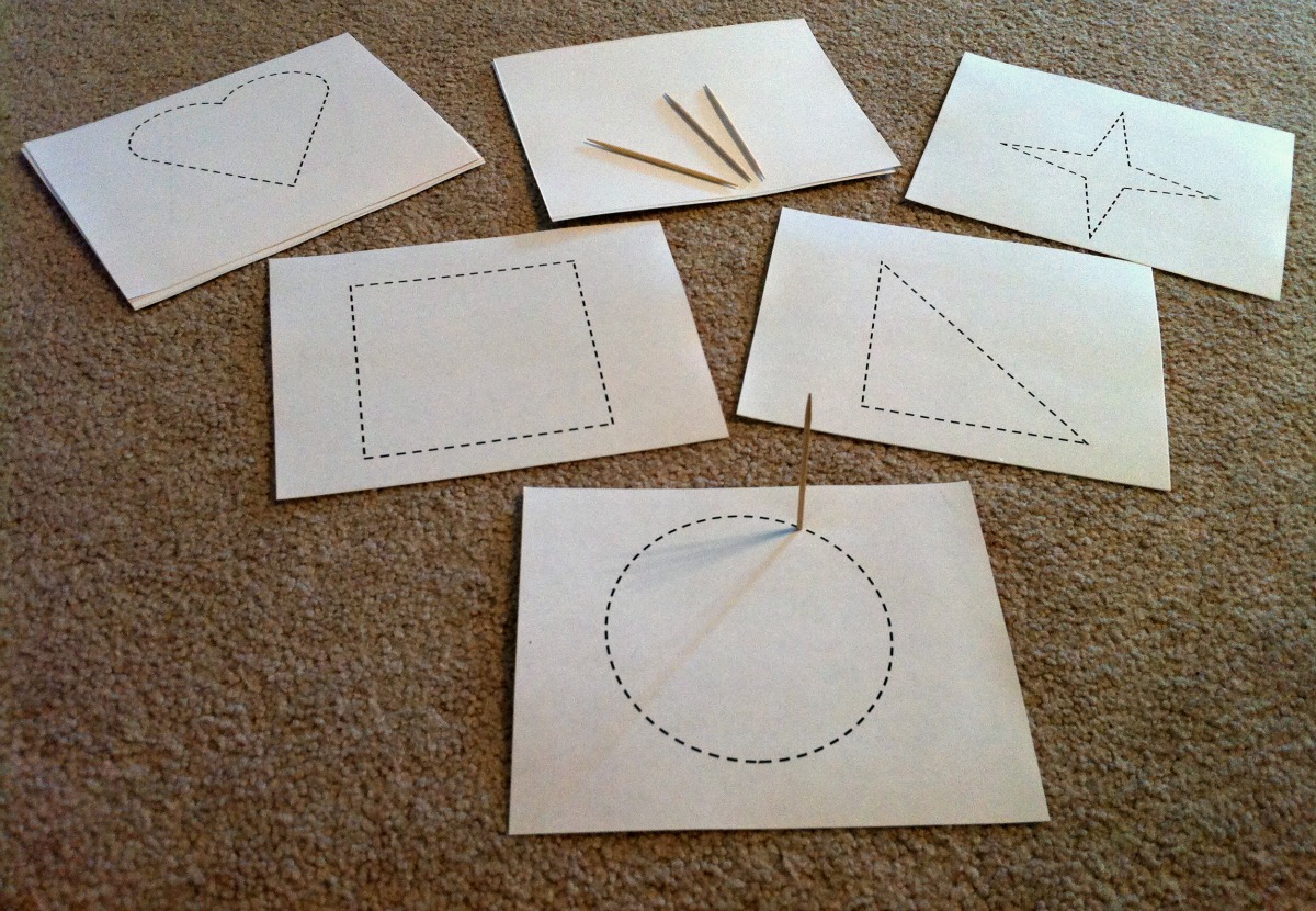 This one is pretty simple and yet the kids seem to love it. Just stick a few long bolts and matching nuts and washers in a bag. They screw them on and take them back off. They try to see how many nuts will fit on one bolt. They can make a pattern (one washer, one nut, one washe, one nut). Insipiration here.