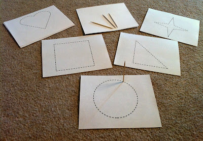 I enlisted my husband's help with a single polite request (or perhaps a little begging and pleading) for this one. He cut some pieces of wood and drilled holes in them for me. We did two different shapes for variety, but I wanted one as a 3x3 grid so that in future years the children can play tic-tac-toe with them. Then just stick the drilled wood pieces in a bag with some golf tees and marbles. The idea is for the children to insert the golf tees in the holes (great fine motor activity with color identification and pattern making potential) and then try to balance marbles on top of the golf tees. Insipiration here and here. For a slightly different version using a foam block instead of wood blocks here.