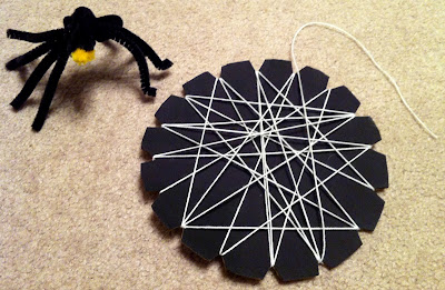I cut and circle and then cut notches around the circumference of the circle. Then I painted the circle black and taped one end of a long string to the center back of the circle. I also made a spider out of pipe cleaners. The kids will wrap the string around the circle to make a spider web for the spider. You could also make a white circle and use light blue yarn to make a snowflake for a different theme. Or you could do any color combination and it would still be a beautiful non-thematic project. Older children can focus on weaving patterns to make a variety of interesting results. Younger children will weave randomly resulting in a more spiderweb like creation. Insipiration here.