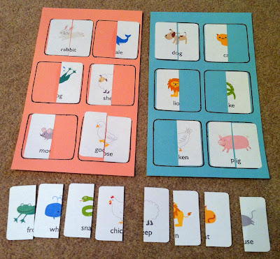 I found some great free printable animal flashcards. I printed them, cut them out, and laid them out on some cardstock and traces squares around them. Then I cut them in half and glued half of the picture onto the cardstock squares. The other half of the flashcards are the puzzle pieces. Insipiration here.