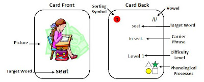 In the mean time, here's a sneak peek of the additional features I've added to the backs of cards in the card sets. I found that I wanted the card sets to be easily sortable by a variety of features. I also wanted a way to easily sort card sets apart if I needed to mix them together in a therapy session. So all the initial and final cards in the sets have the following features.